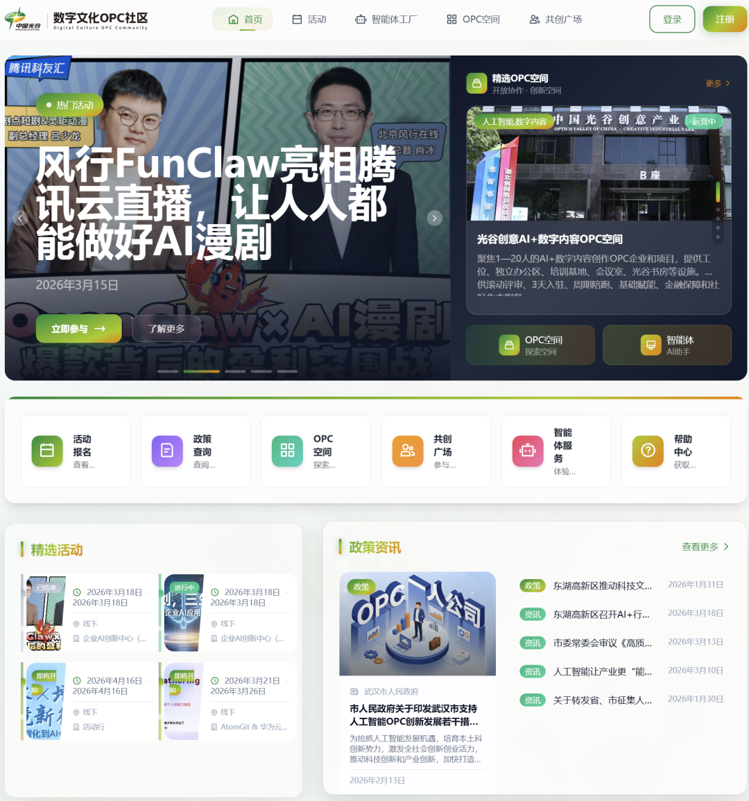 公共技术服务平台方面,光谷整合风行在线橙星梦工厂、360纳米漫剧流水线、灵境万维、智灵动力等行业领先平台工具,上线数字文化OPC-AI公共服务平台(网址:https://ggszwhopc.funshion.net/,可点击文末阅读原文访问),帮助OPC快速完成创作。该平台还融入数字视听行业首个FunClaw(龙虾)智能工具,聚焦OPC管理、算力补贴、商业增长三大核心板块,为AI漫剧、网文、短视频等不同赛道创业者提供政策指南、主体登记、商单对接、推广渠道等一站式服务。平台还搭建了线上交流社区,为创业者提供培训、案例分享等成长支持。